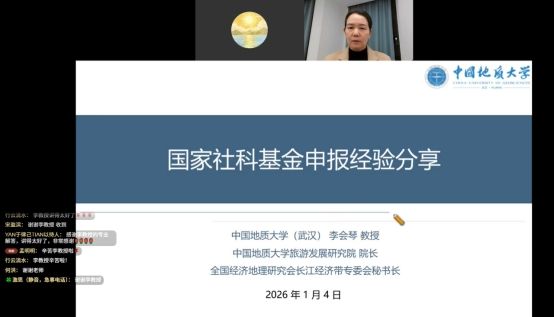 2026年1月4日晚,学院邀请中国地质大学(武汉)李会琴教授,在线上平台开展了“国家社科基金项目申报经验分享”的专题培训讲座。本次培训由经济学院副院长罗伟主持,包括我校及国内其他高校的近千名教师线上聆听了讲座。