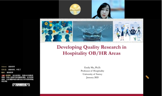 2026年1月4日下午,学院邀请英国萨里大学酒店与旅游管理学院Emily Ma(马金涛)教授,在线上平台开展了“从设计到发表:高质量期刊论文的设计原理与发表策略”的主题培训讲座。本次培训由经济学院副院长罗伟主持,包括我校及国内其他高校的近千名教师、硕士研究生线上聆听了讲座。